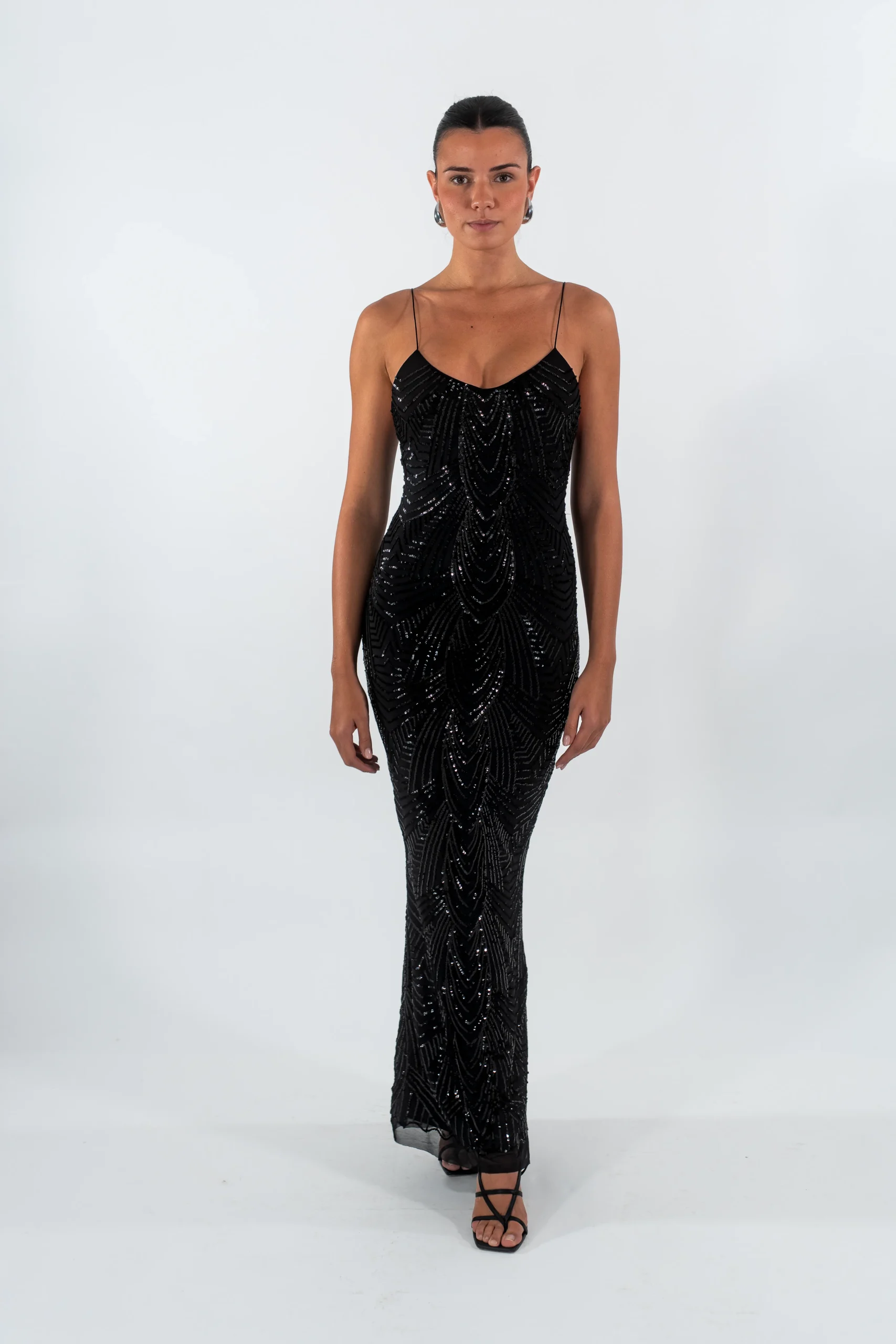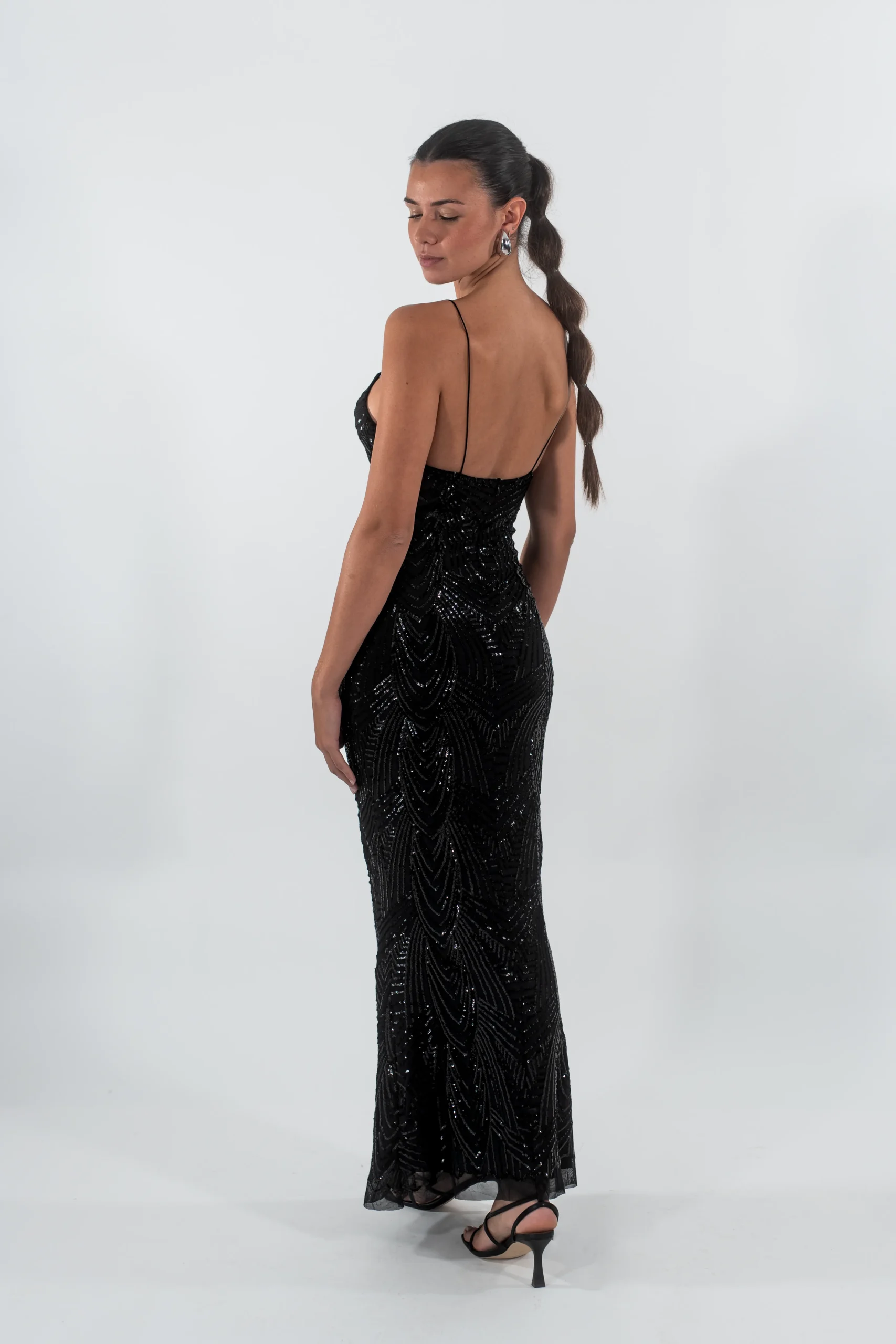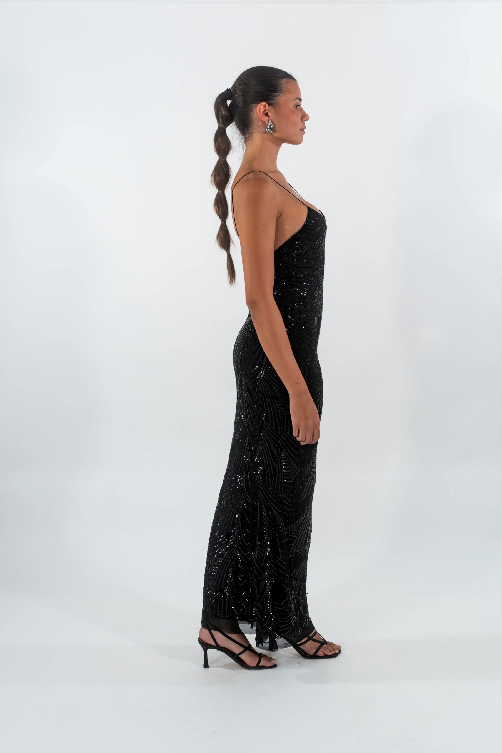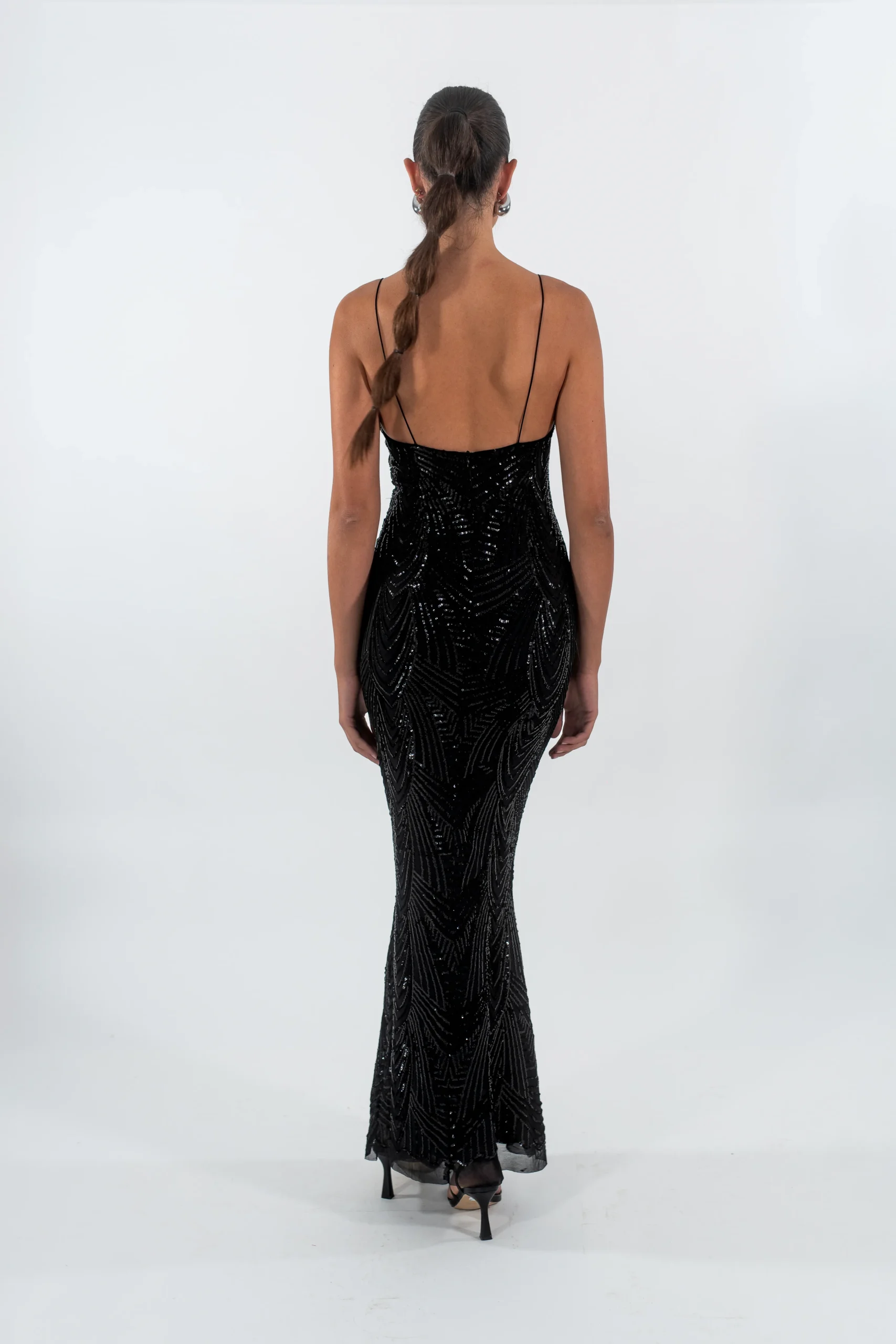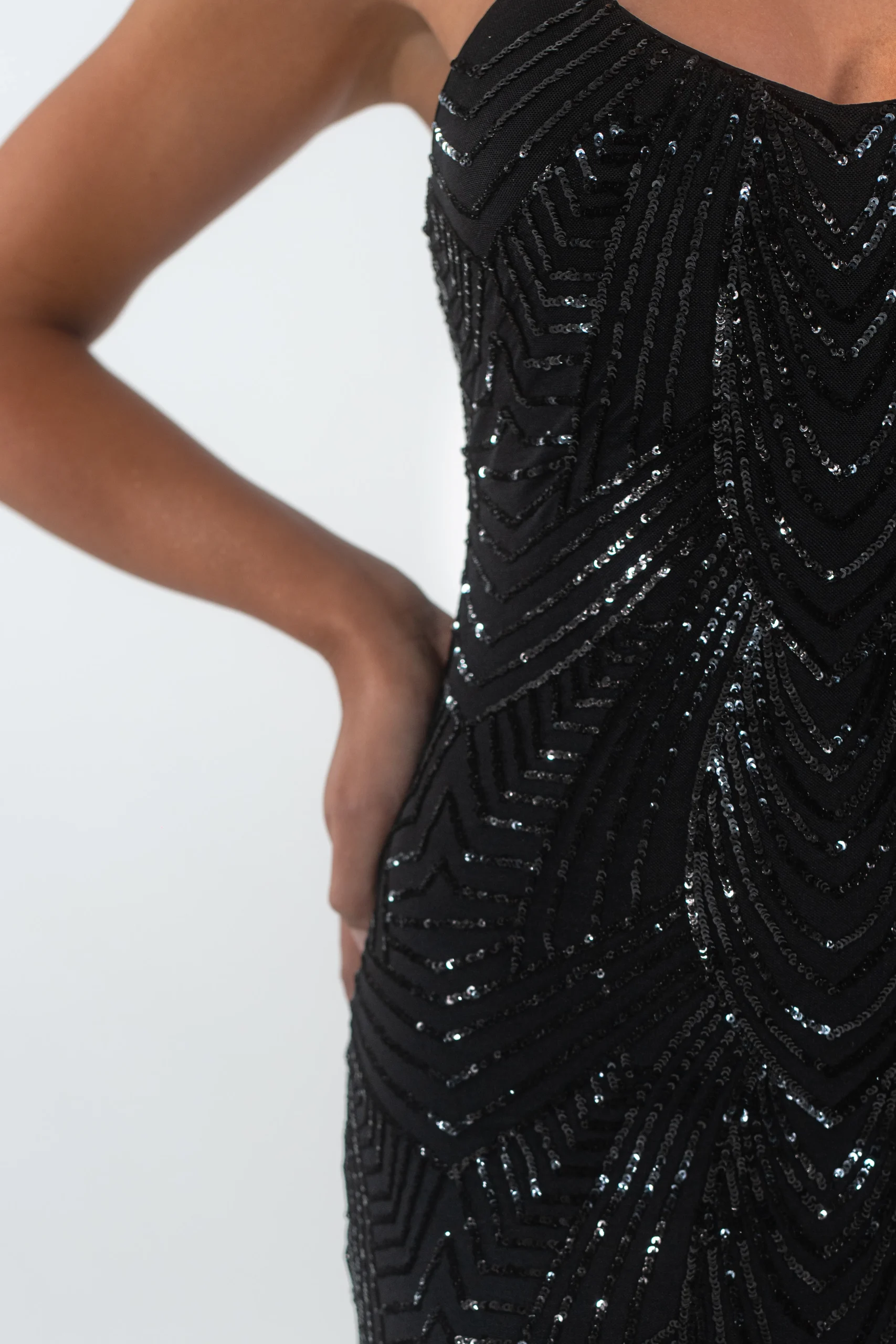 Vestido negro con lentejuelas bordadas y forro. Confeccionado en tejido de punto elástico (100% poliéster).