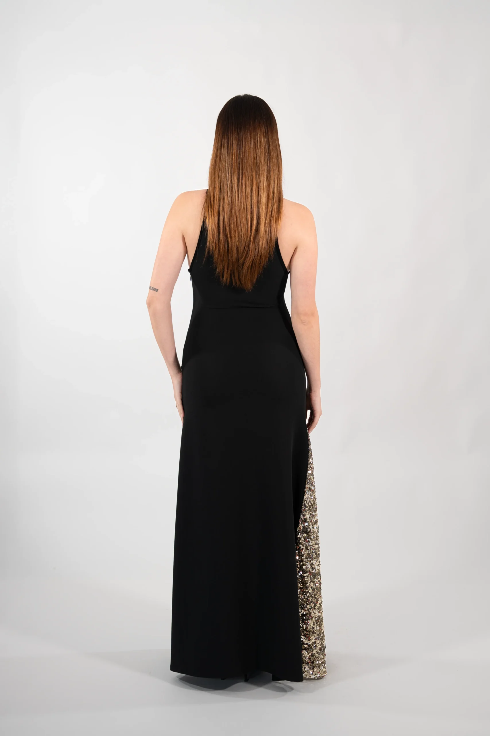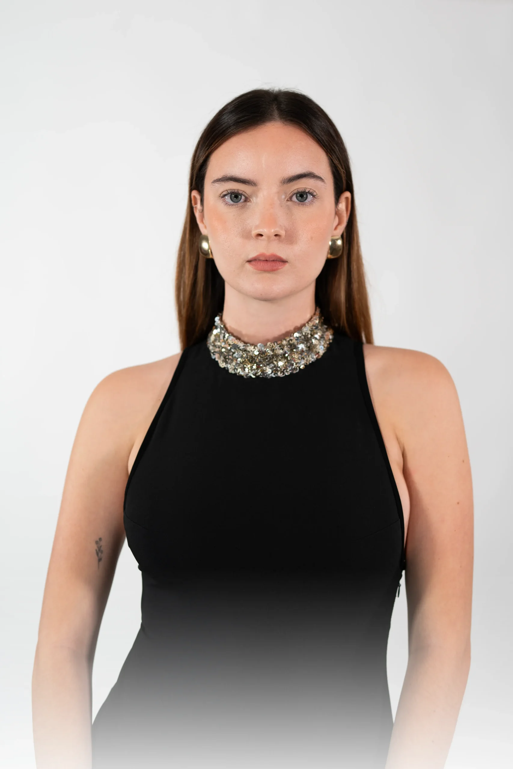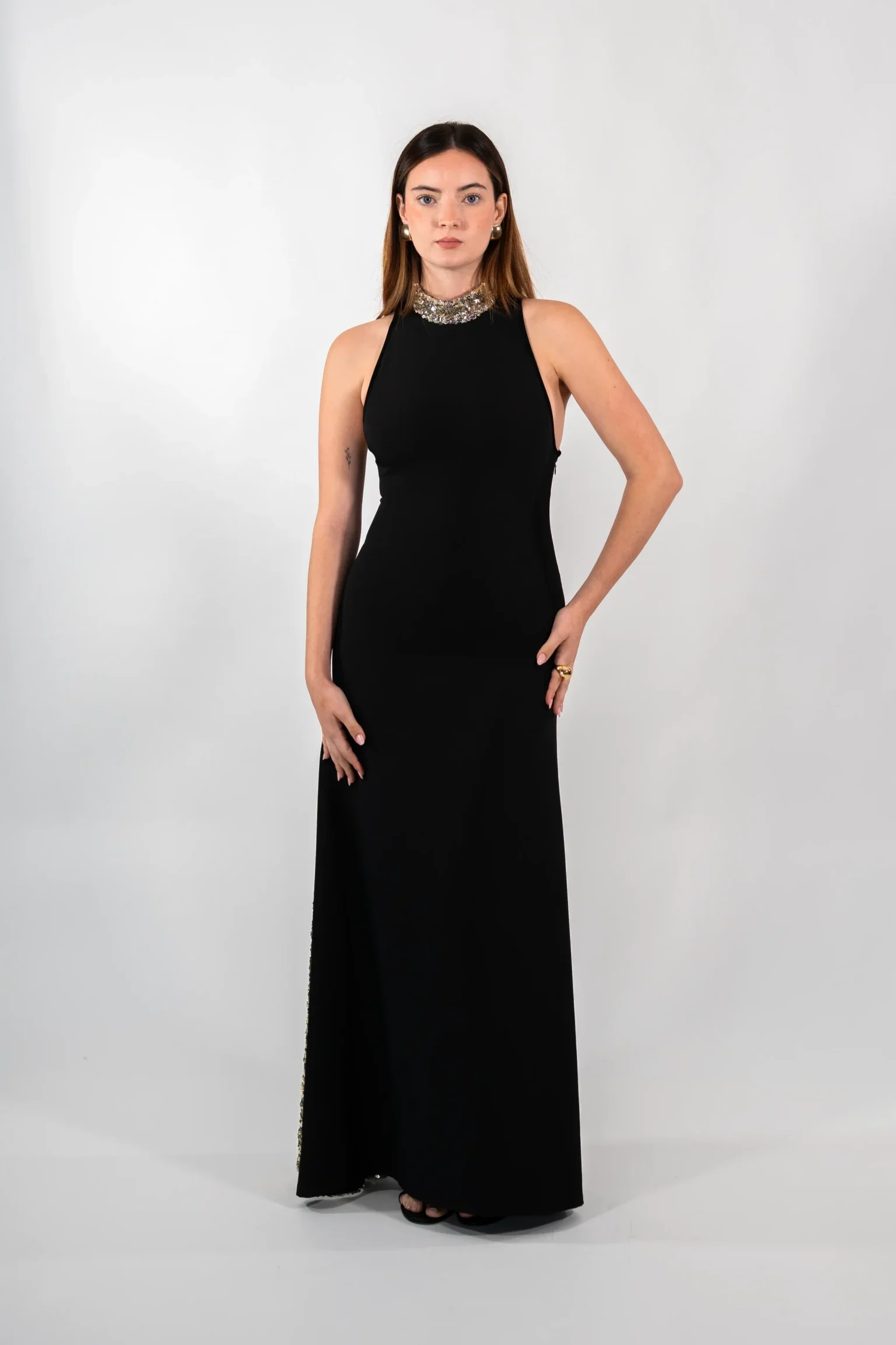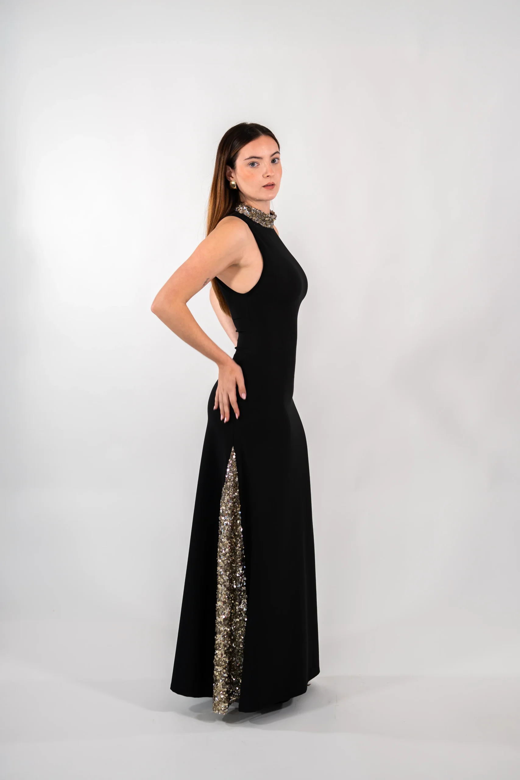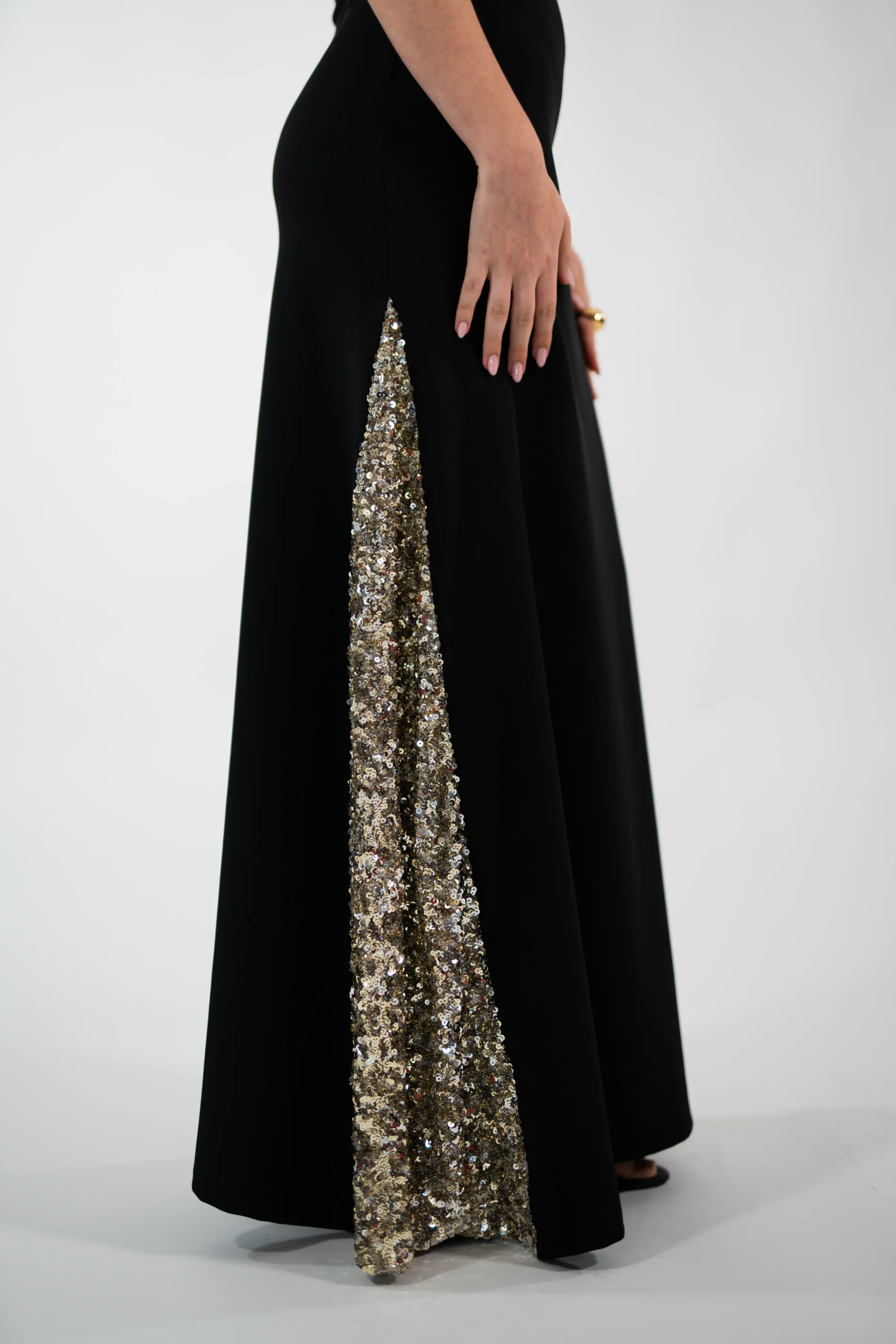 Vestido negro con detalles de godet y escote de lentejuelas doradas y plateadas. Confeccionado en tejido de sarga elástica (89% poliéster, 11% elastano).